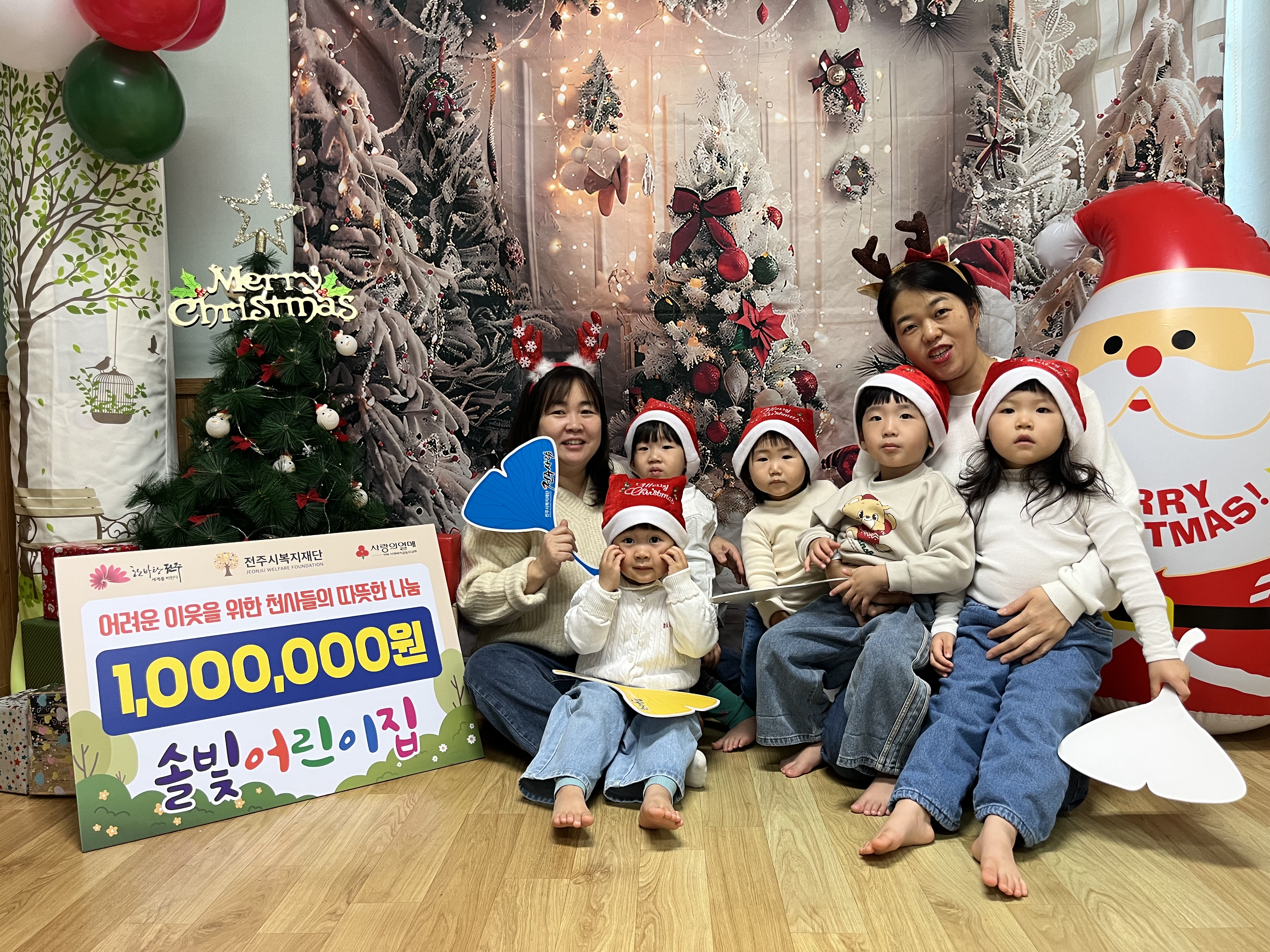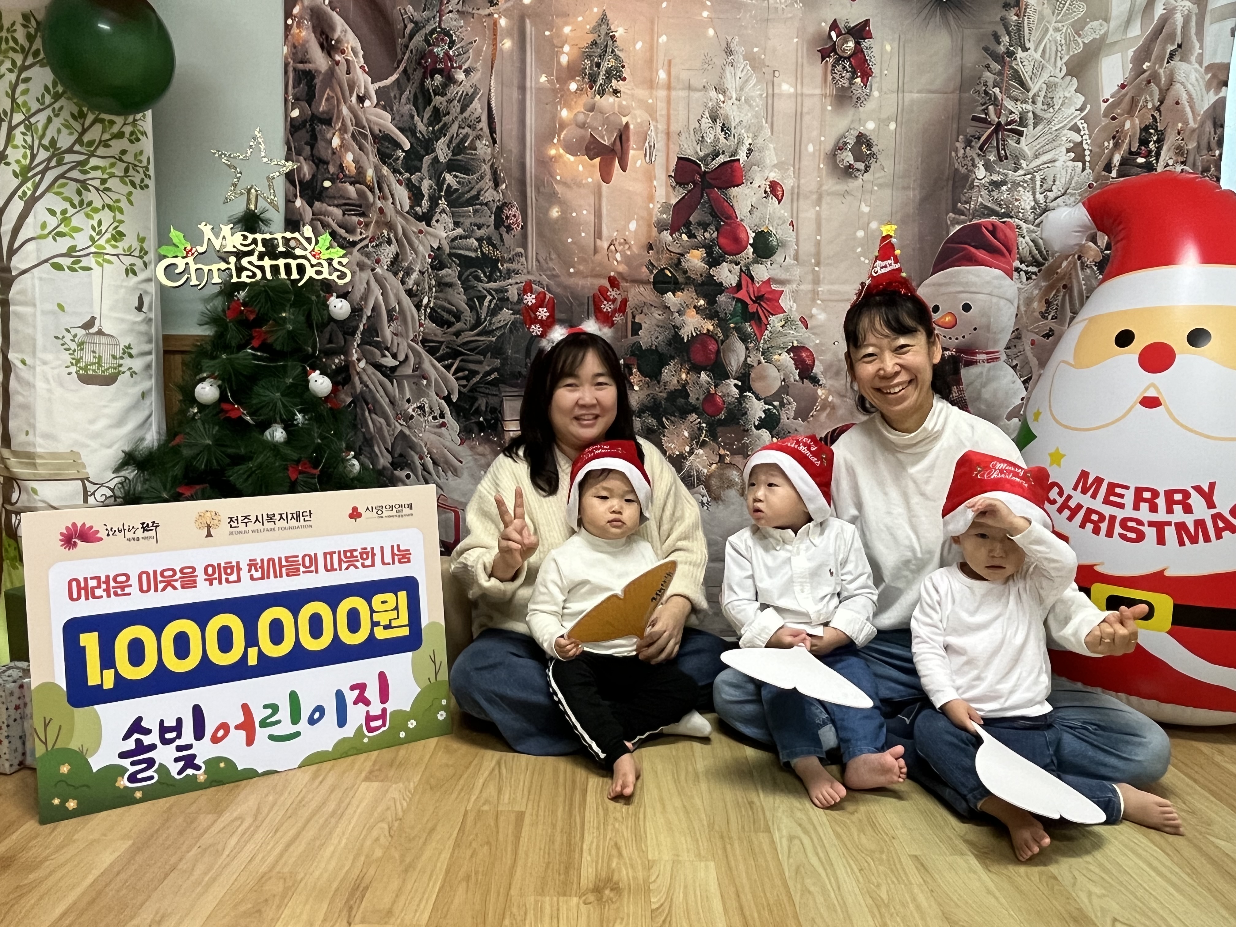 솔빛어린이집 원아들과 학부모가 함께한 바자회 수익금 전액, 성금 100만 원이 복지 사각지대 이웃을 위해 전주시복지재단에 전달해주셨습니다.