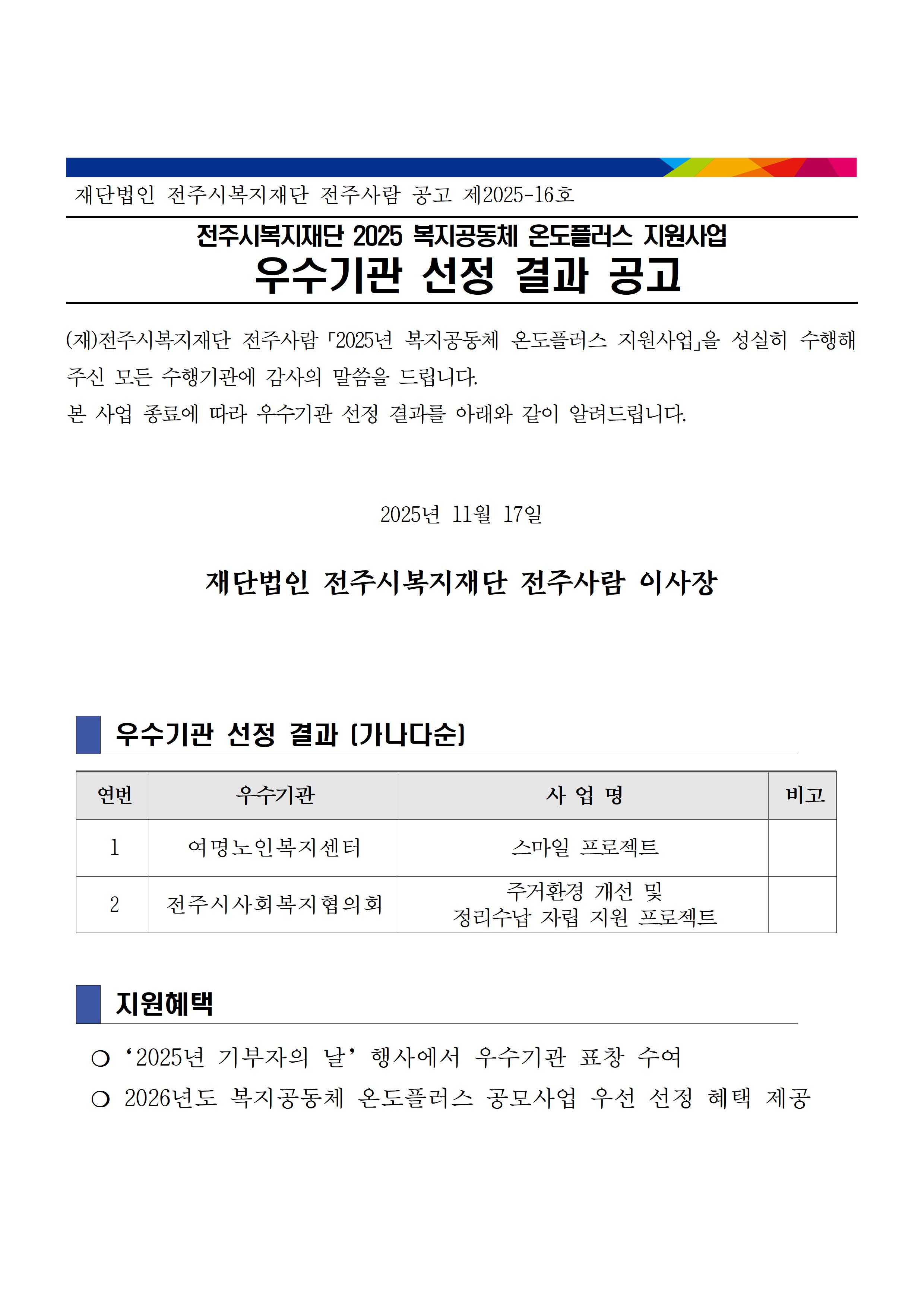 복지공동체 온도플러스 지원사업 수행기관 선정 결과 공고