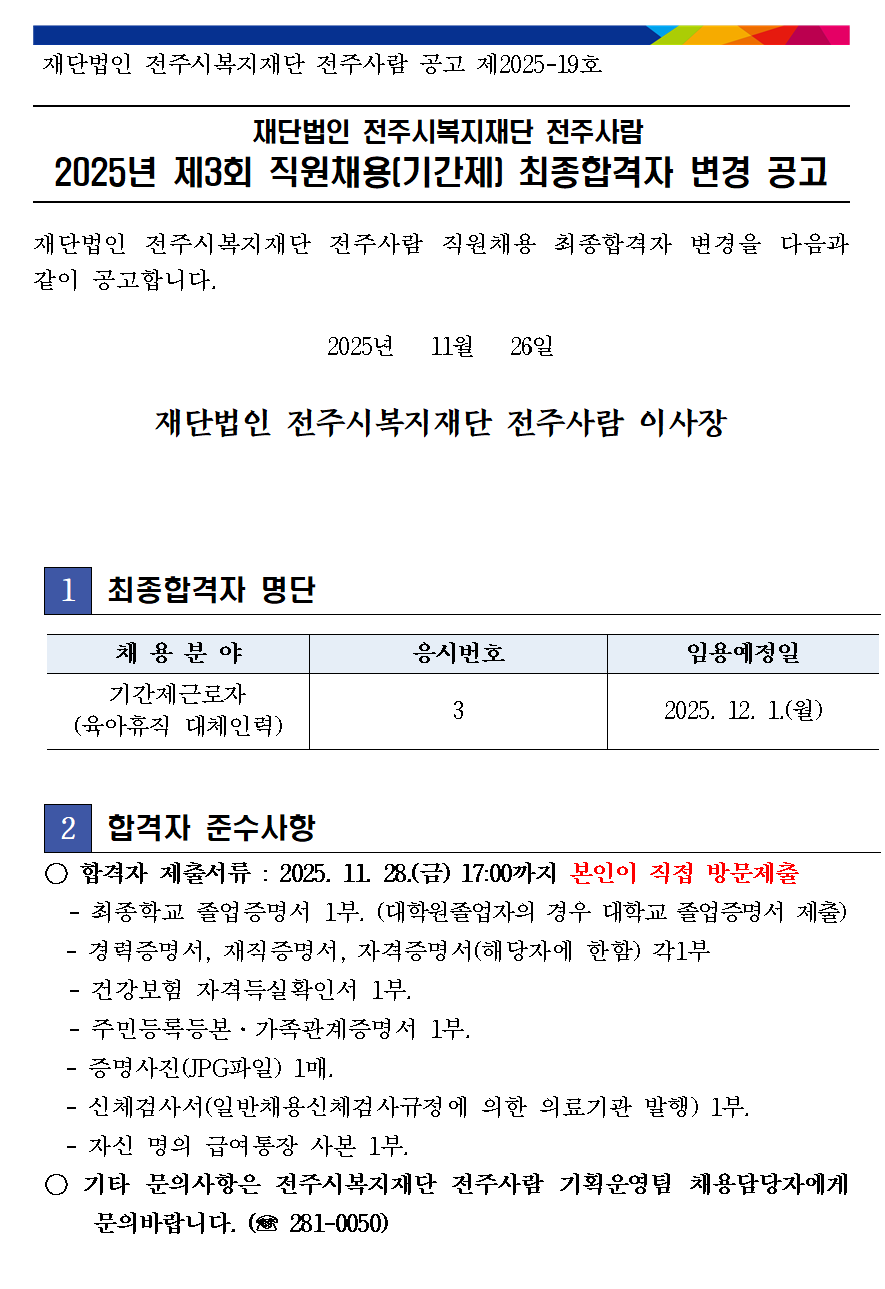 2025년 제3회 직원채용 최종합격자(기간제근로자) 재변경 공고